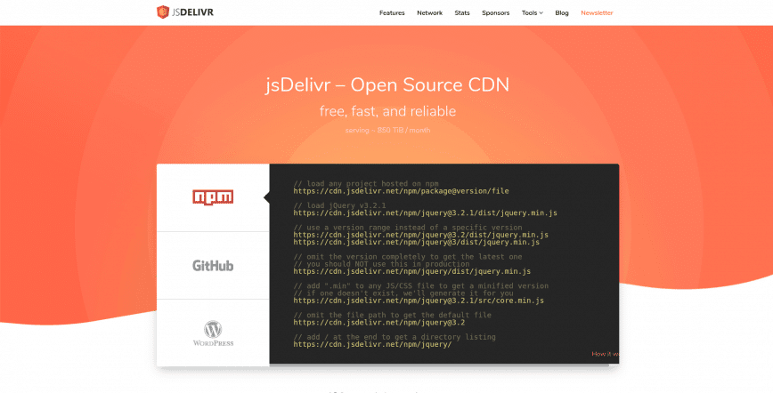 JSDelivr (stylized as jsDelivr) is a free public CDN for open-source projects. It currently takes 3rd place as one of the most popular public CDNs globally (that hosts multiple projects). Now, it can serve web files directly from the NPM registry and GitHub repositories without any configuration.