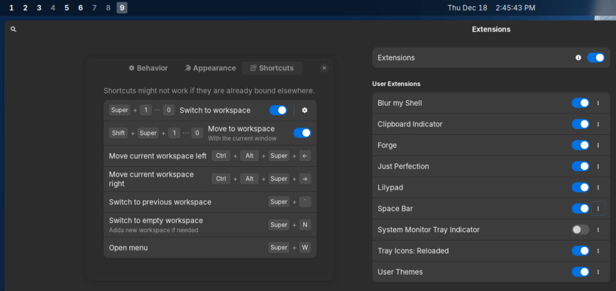After enjoying i3 for several years, replicating this setup in GNOME by enabling static workspaces, and using GNOME’s keyboard shortcuts was not a simple task. I quickly ran into the limitation that GNOME only supported switching to workspaces 1-4 via shortcuts unless you used an extension (see my list of installed extensions above) or manually edited keyboard shortcuts via dconf. Before all of that, I used Pop Shell, which was great but had its quirks, and System76 moved most of their development to the Cosmic desktop.