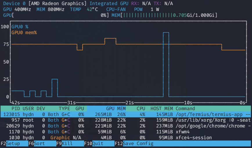 radeontop(sudo apt install radeontopon Debian or Ubuntu). - Run it and leave it open in a terminal.